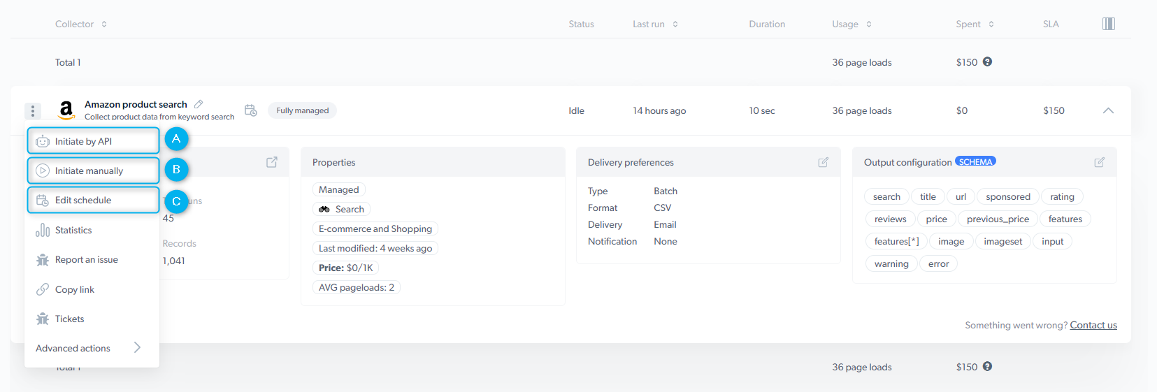 The scraper action menu allows performing different actions with the scraper.- Initiate by API - start a data collection without having to enter the control panel