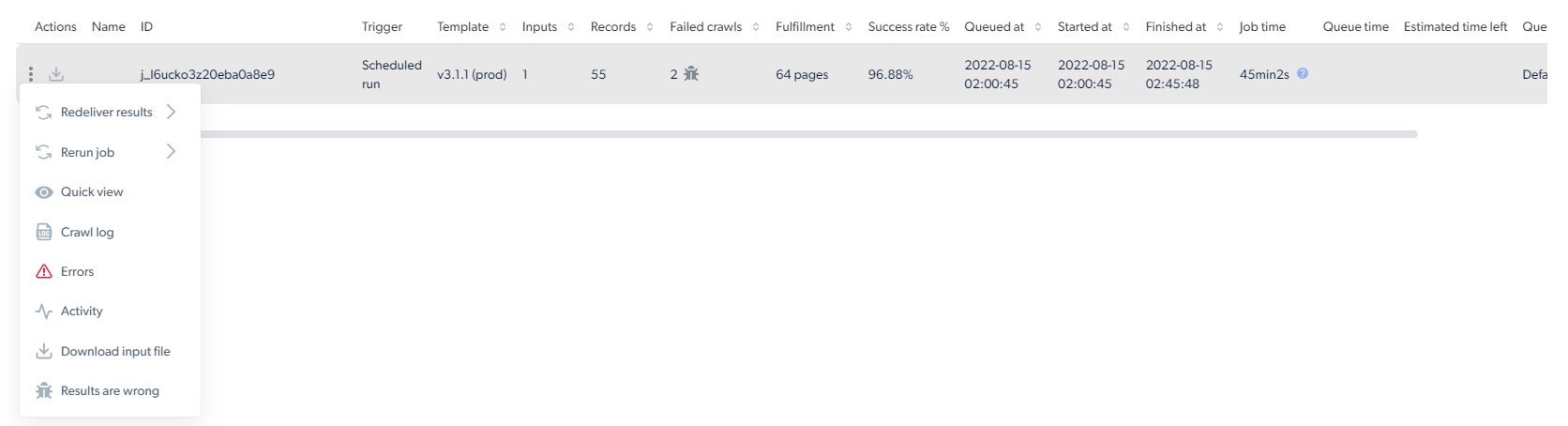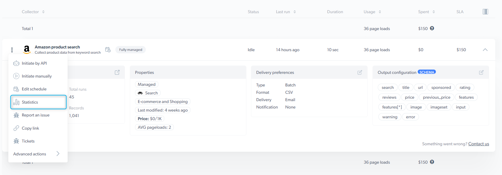 - 3 dots Here you can perform different functions with the data collection job: The statistics page presents essential information about the success of the data collection. Below is a list of all the terms included in the statistics table: