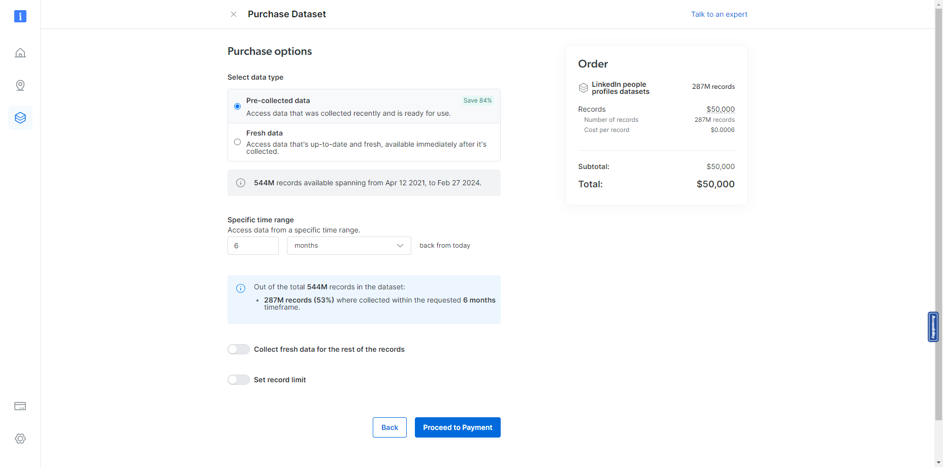 - Set record limit - Enter the number of records you would like. Records are selected randomly. Notice that the price will change according to the record count.
