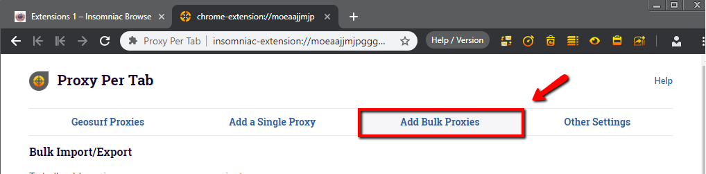 - In Insomniac Proxy per tab extension select Manage Proxy list, and select Add bulk proxies