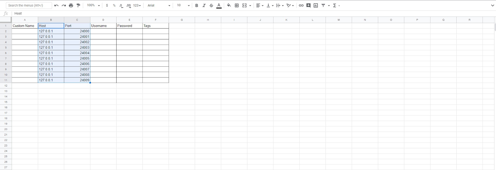 24XXX username,password, and Tags: leave EMPTYProxy Manager has already been authenticated with the Super Proxy- Save the file as a CSV and not as an XLS or XLSX
